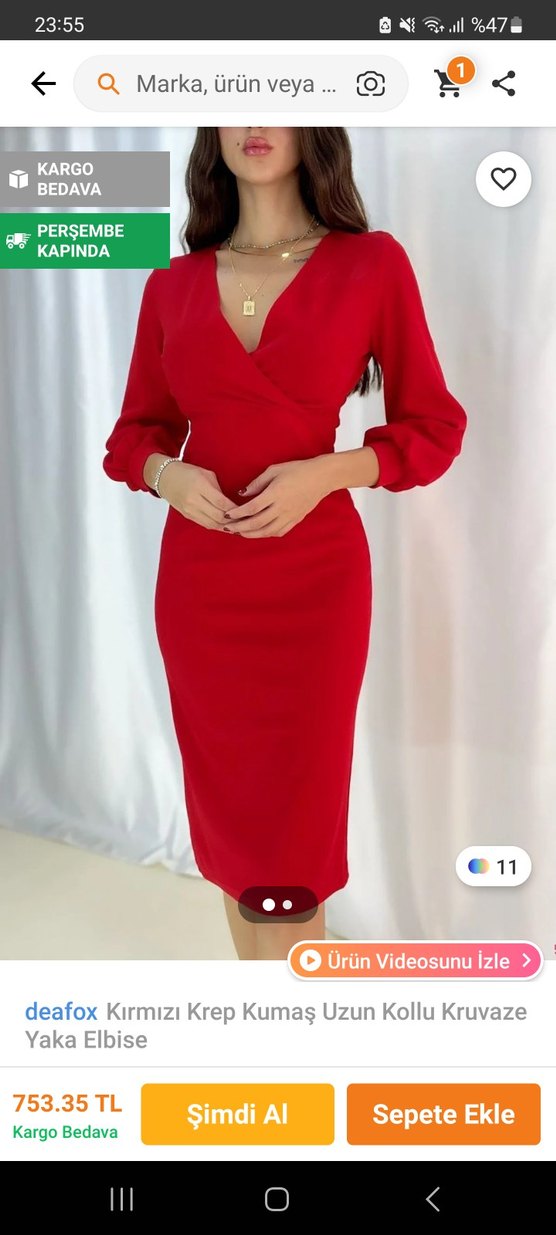 Uzun kollu, V yakalı kırmızı kalem elbise. Drapeli tasarımı ve vücuda oturan kesimiyle şık ve modern bir görünüm sunar. m beden ama s-m gibi düşünebilirsiniz kalıbı dar
