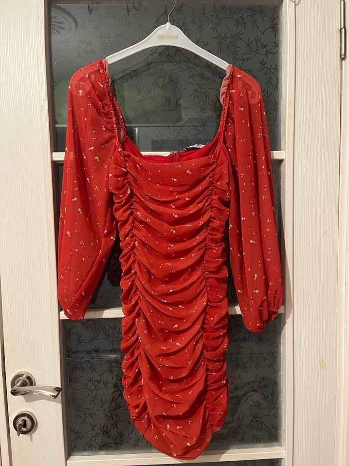 Uzun kollu, V yakalı, drapeli ve parlak kırmızı desenli kumaştan yapılmış, vücuda oturan mini elbise.