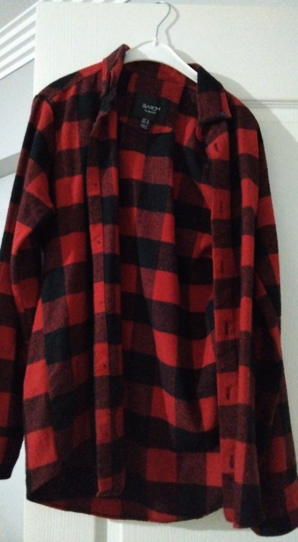 erkek için uzun kollu, düğmeli, gevşek kesim kırmızı ekose gömlek. Yumuşak ve sıcak kumaştan, rahat sokak stili için uygundur.