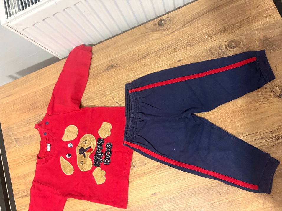 Uzun kollu, yuvarlak yakalı kırmızı üst, renkli baskılı köpek desenli ve kırmızı şeritli lacivert pantolonlu yumuşak ve sıcak kumaştan bebek takımı. Velcro detaylı.