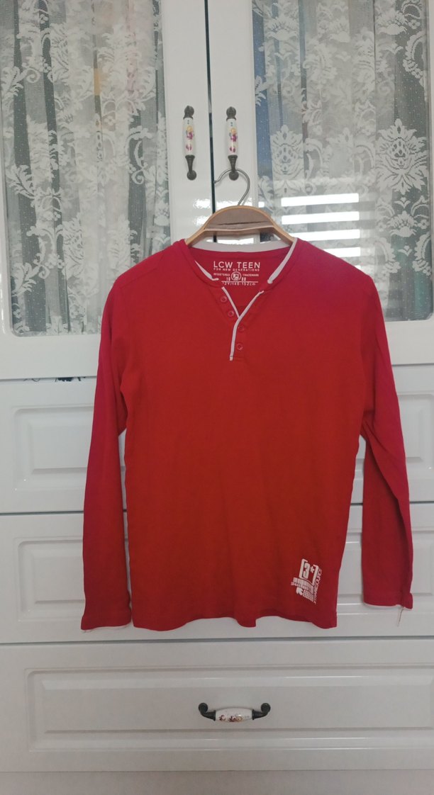 Uzun kollu, bisiklet yaka kırmızı erkek çocuk tişörtü. Pamuklu, bol kesim, parlak ve baskılı tasarıma sahip. "CW.TEEL" etiketi bulunur.