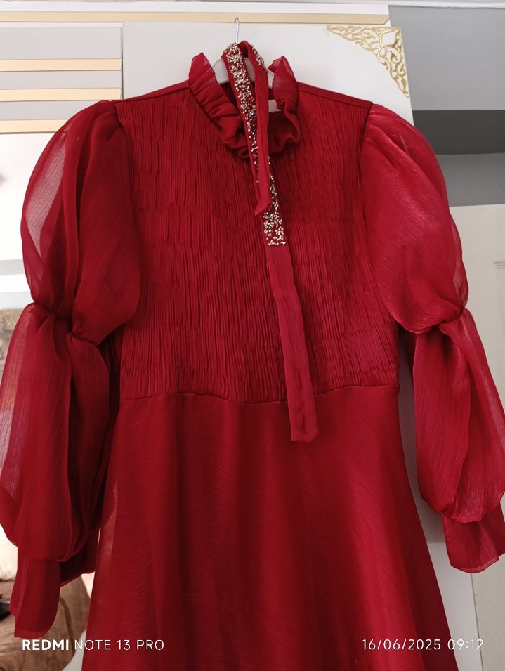 Uzun kollu, yüksek yakalı, fırfırlı detaylı kırmızı bol kesim elbise. Parlak kumaş ve işlemeli desenlerle süslenmiştir, düğünler için uygundur.