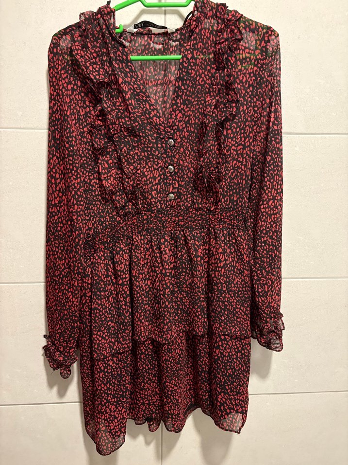 Uzun kollu, kırmızı elbise, V-yaka ve fırfır detaylarıyla bohem tarzı yansıtır. Koyu tonlu batik desenlidir.