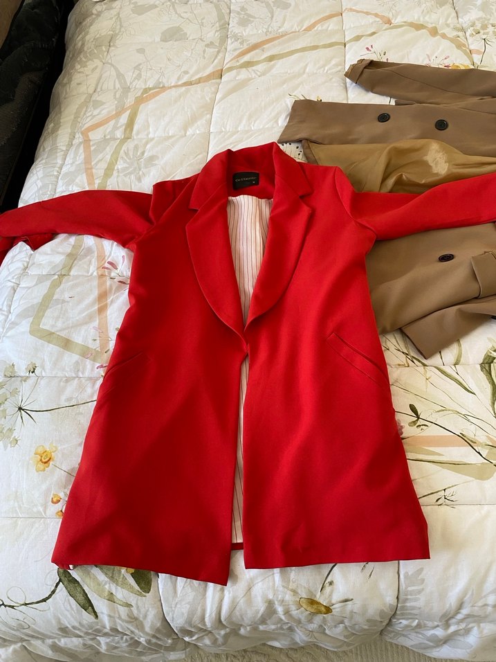 Notlu yaka ve uzun kollu, düğmeli kırmızı kadın blazer. Parlak kırmızı renkte, regular fit ve sıcak kumaştan, ofis için uygun.