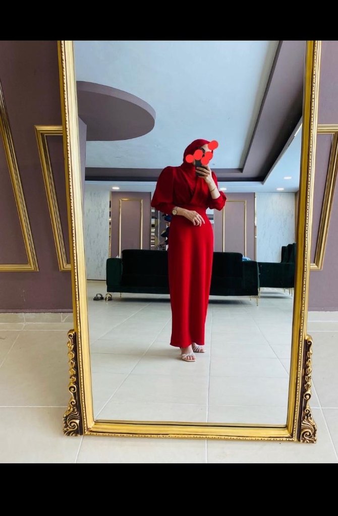 Kadınlar için uzun kollu, parlak kırmızı ipeksi kumaştan yapılmış elbise Yüksek yakalı, drapeli ve modern klasik stilde, düzenli kesimle günlük kullanıma uygundur. ✨ Herhangi bir sorunu yok şalla dahil verilecektir