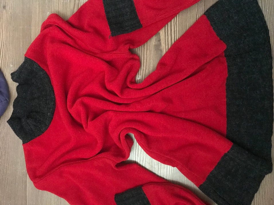 S/m beden Bu uzun kollu kırmızı kadın kazak, yumuşak ve sıcak kumaştan üretilmiş, dar kesim ve bisiklet yaka özelliklerine sahip. Kollarında siyah detaylarla drapeli tasarım sunar. Günlük kullanıma uygundur.