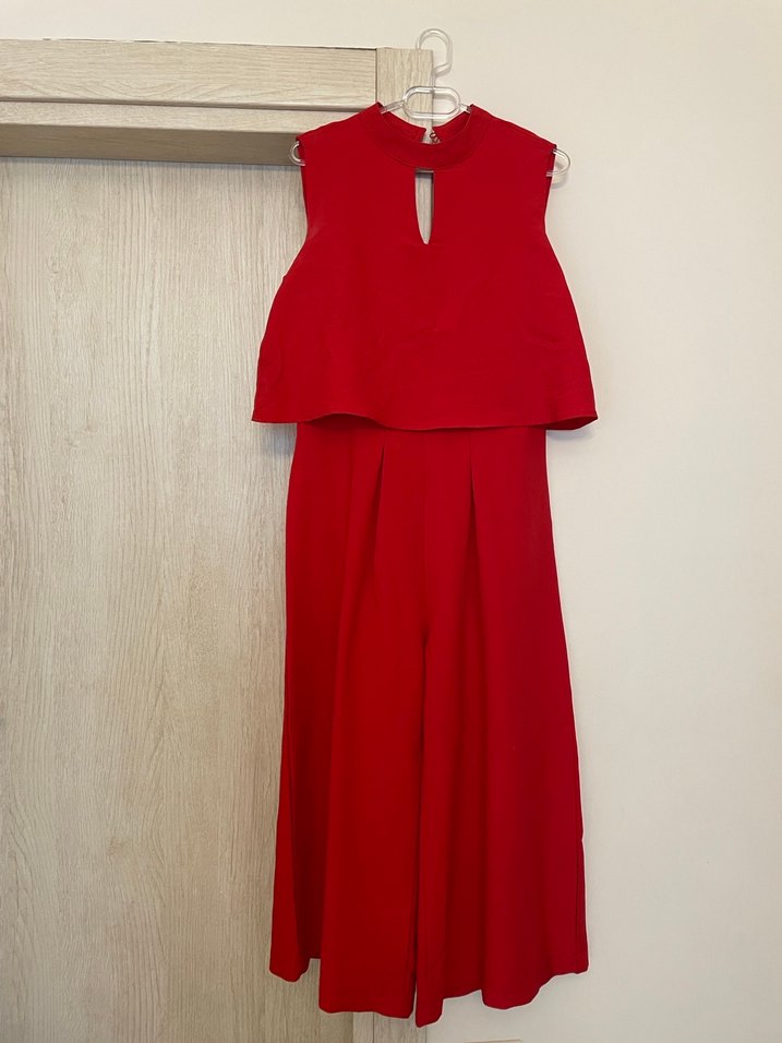Kadınlar için uzun, askısız ve kolsuz tulum. Parlak kırmızı renkte, dökümlü tasarım ve standart kesime sahip. Romantik akşamlar için uygundur. ❤️