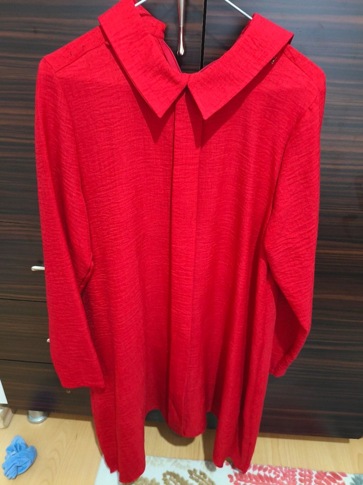 Uzun kollu, düğmeli ve yakalı bu kırmızı keten tunik, bol kesimi ve midi boy uzunluğuyla günlük kullanım için uygundur.