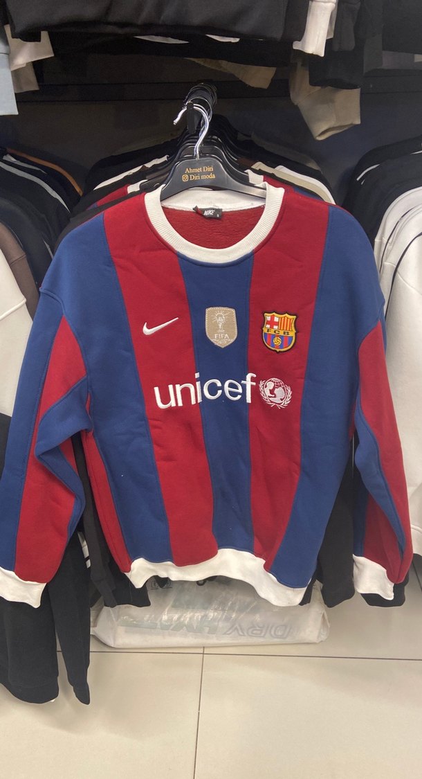 Uzun kollu, yuvarlak yakalı erkek sweatshirt. Koyu kırmızı ve mavi çizgili, yumuşak ve sıcak dokulu örgü kumaştan. Önünde UNICEF logosu bulunur. Spor ve günlük sokak giyimine uygun.