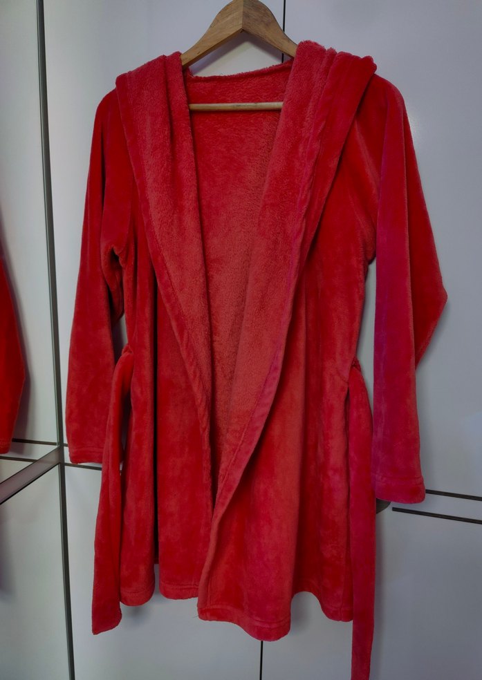 Kadın bornoz, uzun kollu ve midi boyda, rahat kesimlidir. Canlı kırmızı renkte, yumuşak ve konforlu dokusuyla bohem tarzını yansıtır. ️