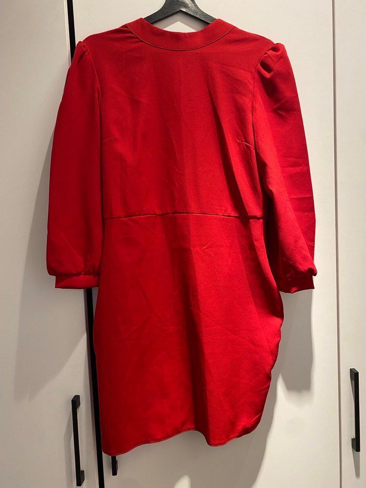 Kırmızı, uzun kollu, yüksek yakalı ve drapeli tasarıma sahip, vücuda oturan midi elbise. Minimalist ve şık, romantik akşamlar için ideal. ❤️
