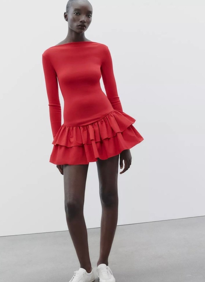 Uzun kollu, bisiklet yaka ve fırfırlı etek uçlu, vücuda oturan kırmızı mini elbise. Pürüzsüz sentetik kumaştan, romantik akşamlar için ideal. ❤️