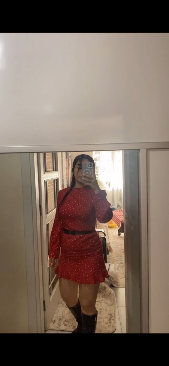 Uzun kollu, yüksek yaka kırmızı mini elbise, baskılı desene ve şeffaf detaylara sahip. Romantik akşamlar için uygun. ❤️