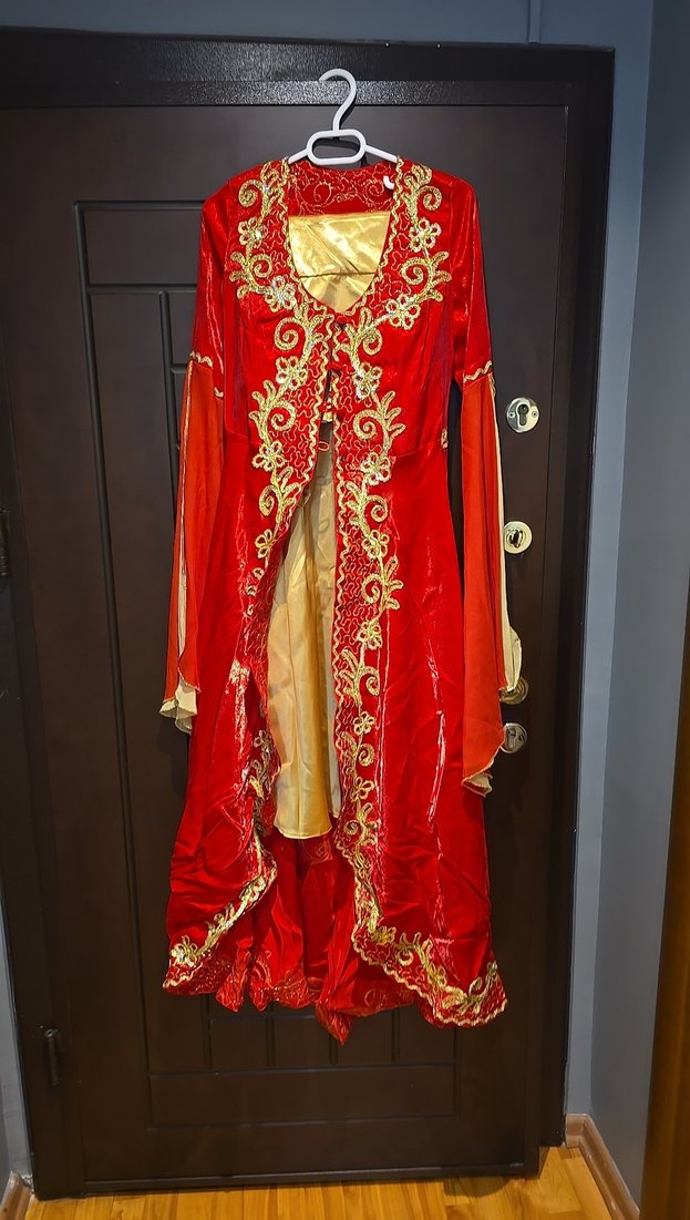 Kına için uygun, drapeli uzun kollu, işlemeli desenlere sahip kırmızı, uzun ve vücuda oturan elbise. Bohem düğün stiline uygun. ✨