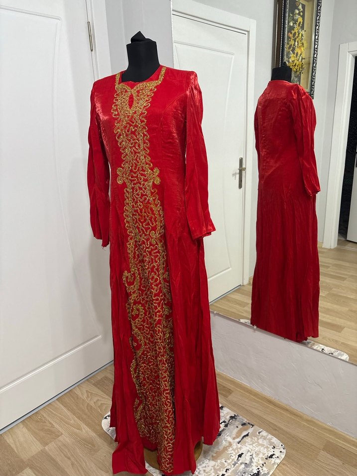 Uzun kollu kırmızı nakışlı kına elbisesi. 42 beden.