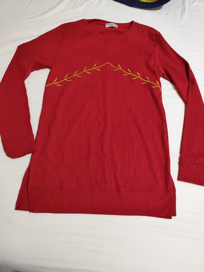Uzun kollu, yuvarlak yakalı ve bol kesim kadın kazak. Kırmızı örme kumaştan, renkli nakış detaylarıyla sade ve bohem tarzda, günlük kullanım için uygundur.