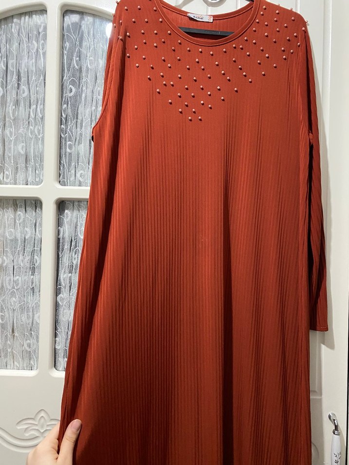 Uzun kollu, bol kesim kırmızı triko elbise. Üst ön kısmında boncuk detayları ve piliseli dokusu bulunur. Minimalist ve trend günlük stil sunar. Yumuşak sentetik kumaştan üretilmiştir.
