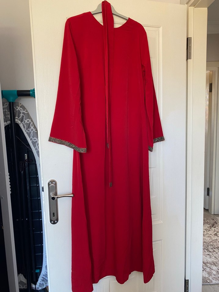 Uzun kollu,kırmızı salaş kadın elbise. İpek gibi kumaştan, drapeli ve parlak yüzeyli, romantik akşamlar için uygun.