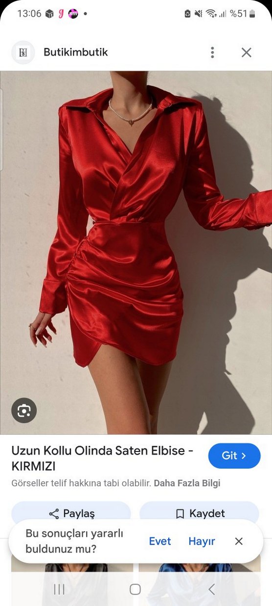 Saten kumaştan, uzun kollu ve V yakalı kırmızı mini elbise. Drapeli ve parlak dokusuyla dikkat çeker, fit kesimlidir. ❤️L beden ama kalıbı dar.