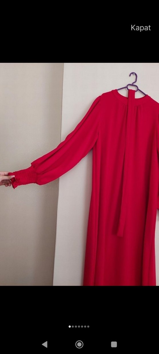 Uzun, salaş kesim elbise, yüksek yakalı ve drapeli uzun kolludur. Saten parlak kırmızı kumaştan, ofis için uygun sade ve modern bir modeldir.