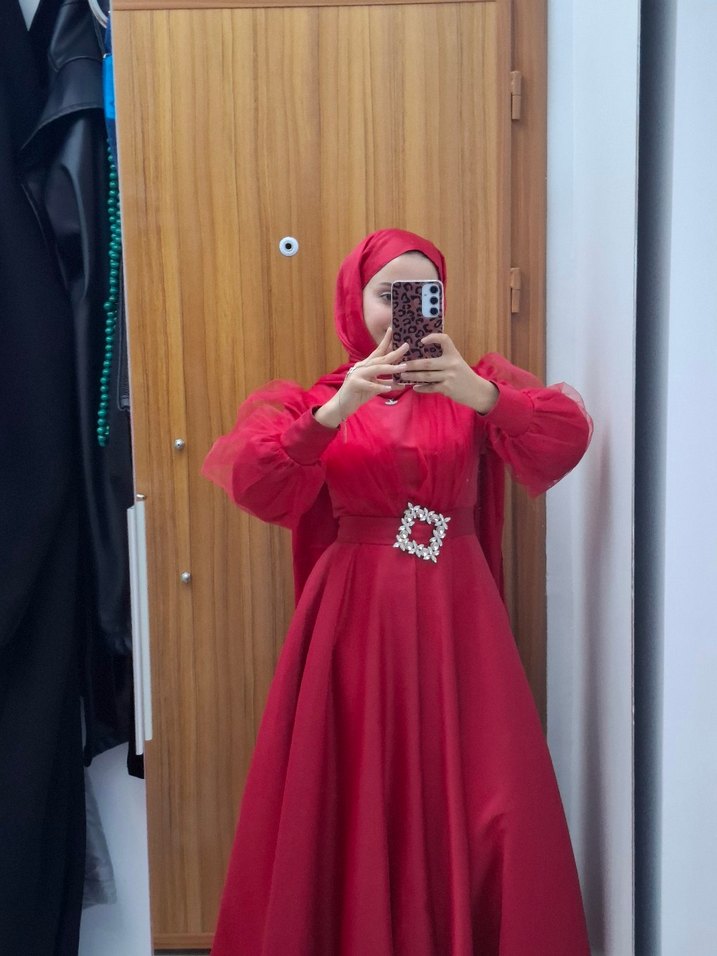 Uzun Kollu Kırmızı Tesettür Bindallı Elbise