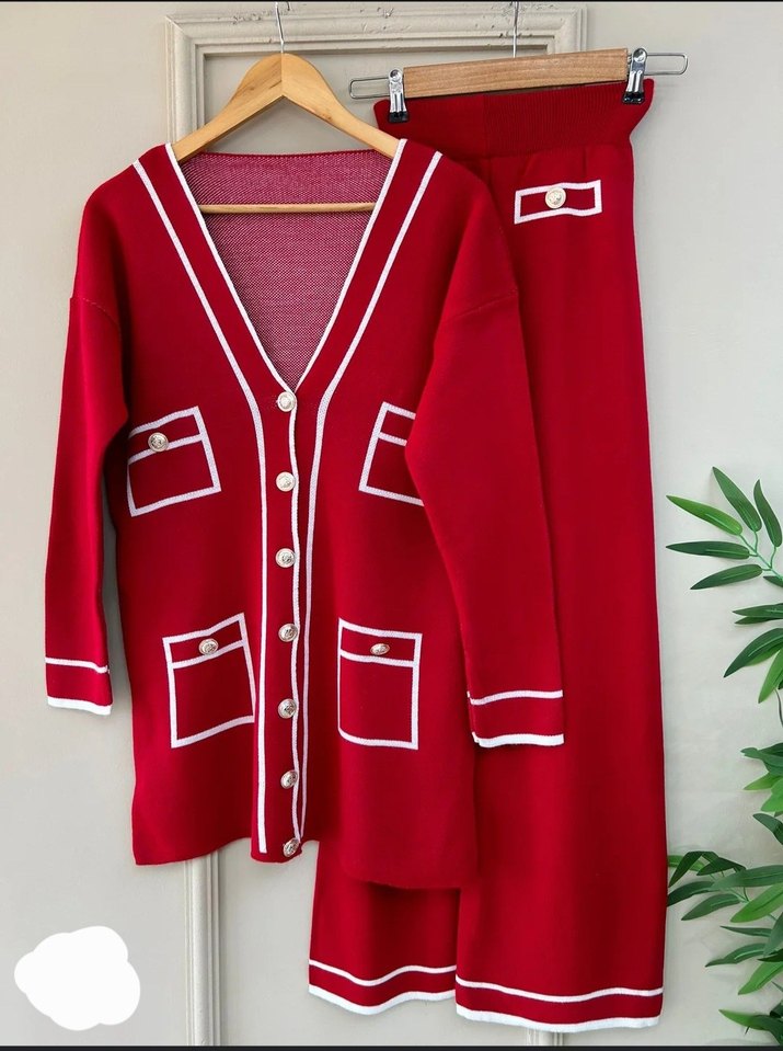kırmızı triko takımdır. Düğmeli, kesik yaka ve uzun kolludur. Beyaz şerit detaylarıyla modern klasik tarz sunar. standart kalıptır ben 42 beden giyiyorum bana rahat oldu birkere giydim