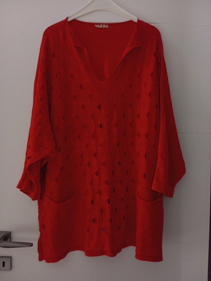 Yumuşak keten kumaştan, uzun kollu ve bol kesim kırmızı tunik. V yaka ve iki ön cep içerir. Minimalist ve bohem tarzda, günlük kullanıma uygun.