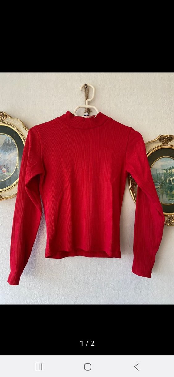 Yumuşak ve sıcak dokulu, uzun kollu, yarım boğazlı, parlak kırmızı renkli, normal midi uzunlukta kadın kazağı.