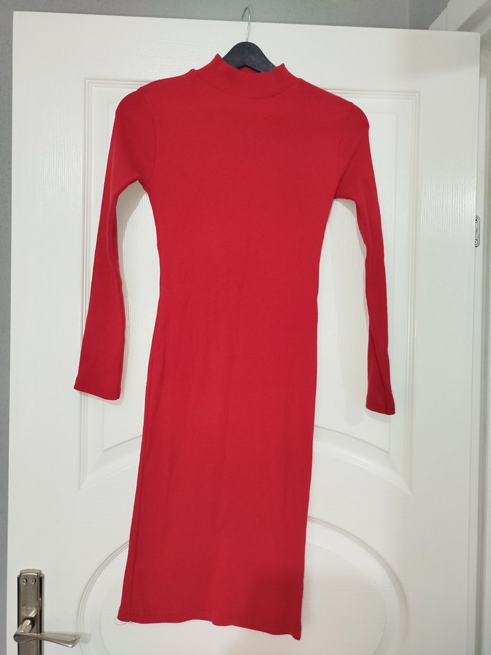 Uzun kollu, yüksek yakalı ve kırmızı renkte dar kesim kadın triko elbise. Esnek kumaş M bedene de olur.