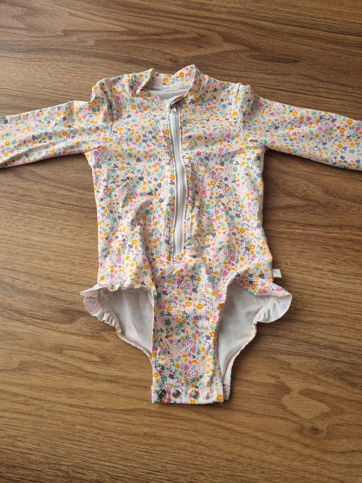 Uzun kollu, ön fermuarlı kız mayosu, pastel çiçek desenleriyle süslenmiştir. Plaj için bohem tarzda bir tasarımdır. Gecen sene 1 yasına girecek kızım için almıstım, etiketlerini kestim ve yıkadım ama tatilimiz iptal oldugu için giydiremedim zaten sonra havalar soğudu ve küçüldü. Hiç giyilmemiştir, tertemiz, 50 uv koruma sağlar, Decathlon markadır
