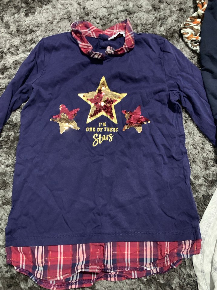 Yumuşak ve sıcak kumaştan, uzun kollu, fitted kesim kız tişörtü. Payetli yıldız baskıları ve ekose desenli katmanlı eteği vardır.