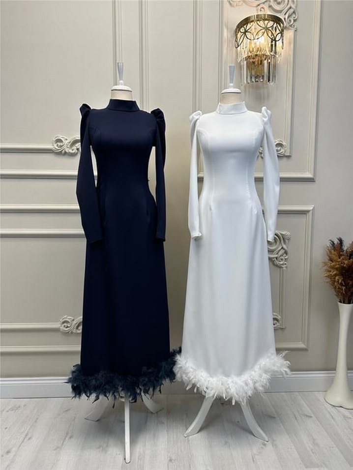 Uzun kollu, etek ucu tüy detaylı beyaz elbise.Klasik modern tarzda, düzenli kesim, şık etkinlikler için uygundur. ✨