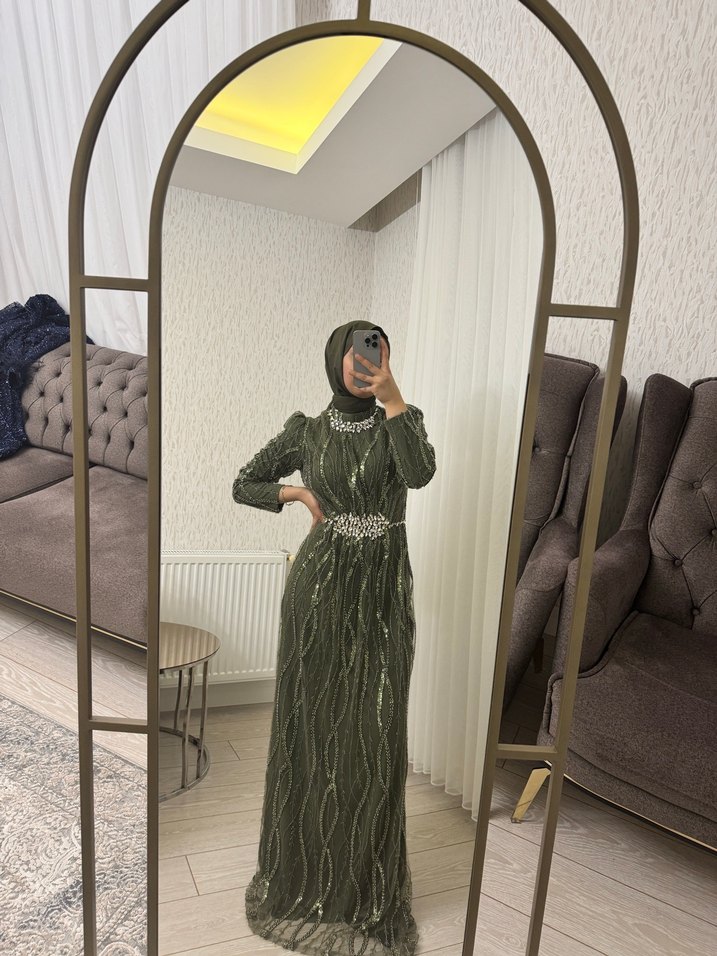 Koyu haki yılan desenli uzun, dar kesim abiye elbise. Yüksek yakalı ve drapeli tasarımı, strappy kollarıyla modern ve mütevazı bir duruş sunar. Sıfır ürün