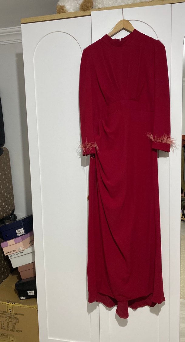 Koyu kırmızı renkte, uzun kollu ve yüksek yakalı, drapeli detaylı, bileklerde tüy süslemeli, klasik ve modern bir abiye elbise.