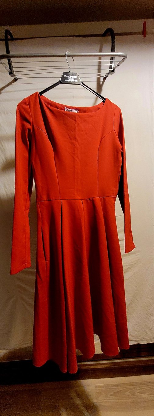 Koyu kırmızı, uzun kollu, drapeli ve tek renk kadın triko elbise, tekne yakalı ve vücuda oturan kesime sahip. etegin ucunda hafif bir ip çekilmesi var belli olmuyor.
