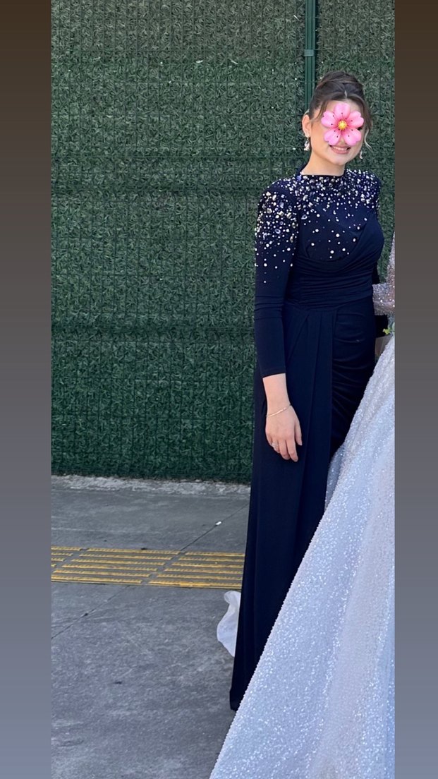 Bu dar kesim uzun abiye elbise, uzun kollu ve yüksek yakalıdır, drapeli detaylara sahiptir. Koyu mavi renkte, desensiz ve düğün için uygundur. Kuyrukludur 20 dk giyildi daha da giyilmedi zayıfladığım için olmuyor 69 kiloyken oluyordu göbek kısmında görseldeki gibi detay vardır :) koları görseldekinden daha uzundur