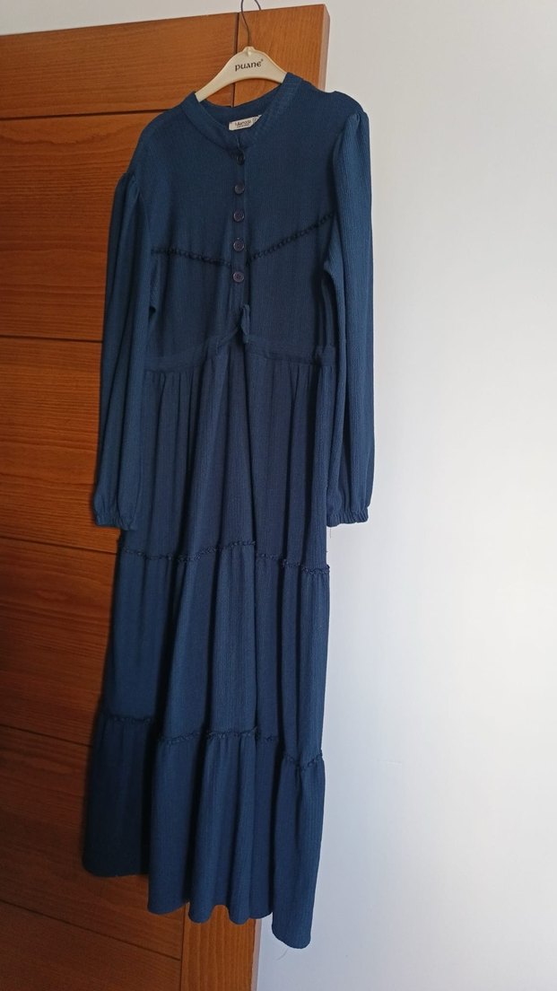 Koyu mavi kumaştan, uzun kollu, pileli ve bol kesim uzun elbisedir.rahat bir görünüm sunar.