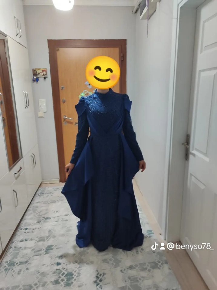 Bu uzun, dar kesim abiye elbise koyu mavi renkte, yüksek yakalı ve uzun kolludur. Gotik ve sade şıklık sunar, düğün için uygundur.