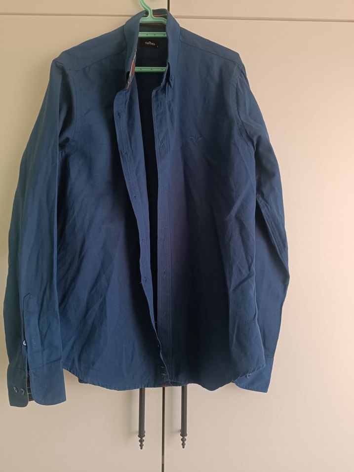 Koyu mavi renkte, keten kumaştan yapılmış, uzun kollu ve çıtçıtlı önüyle günlük kullanım için uygun rahat bir erkek gömleği.