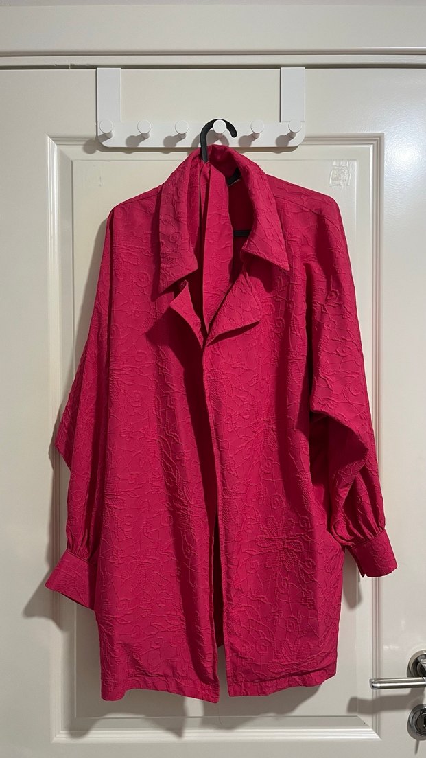 Koyu pembe renkte, keten kumaştan uzun kollu ve uzun kesim gömlek. Düğmeli ön ve kesik yaka detaylarına sahiptir, salaş bir görünüme sahiptir.