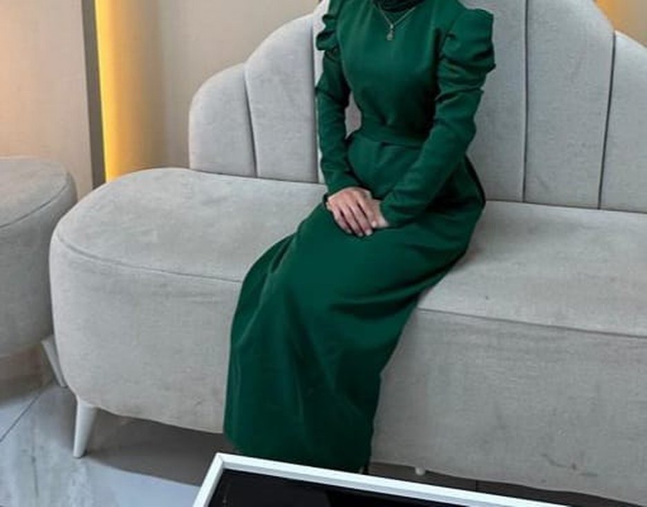 Koyu yeşil renkte, uzun kollu, yüksek yakalı ve drapeli tasarıma sahip uzun elbise. Sentetik kumaştan, klasik ve sade ofis stiline uygun.