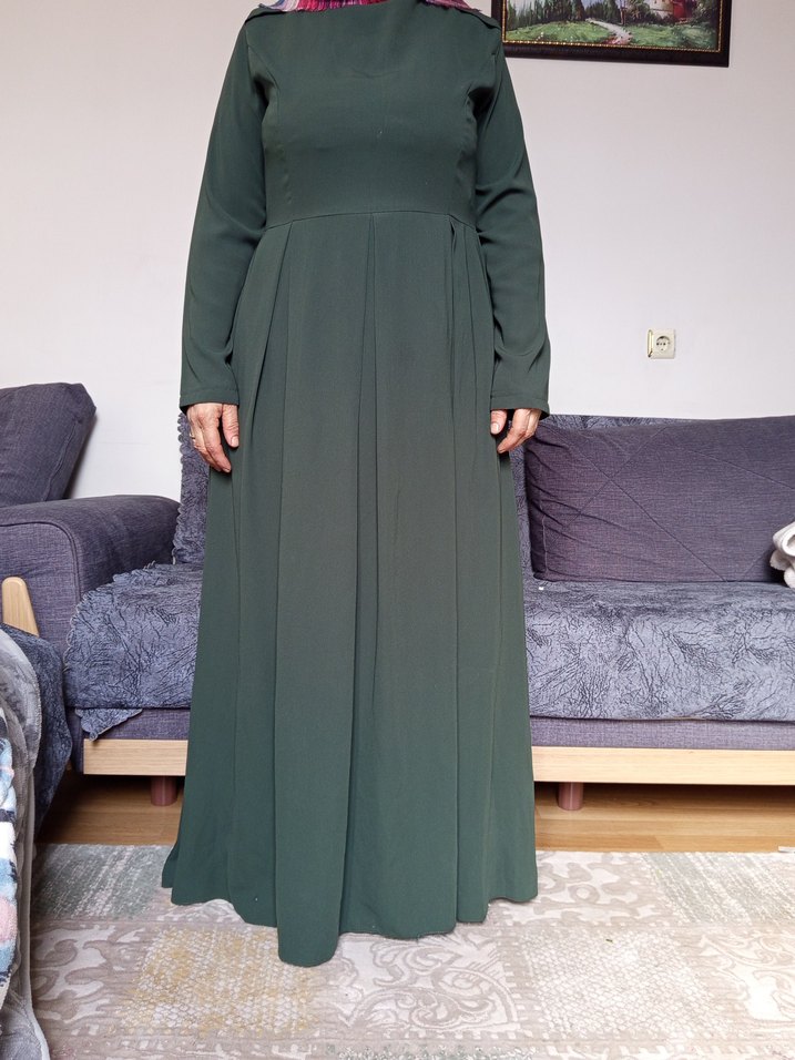 Uzun, salaş kesimli, yuvarlak yakalı ve uzun kollu elbise. Sentetik kumaştan, drapeli ve minimalist tasarımlı koyu yeşil renkte, günlük kullanım için uygun.