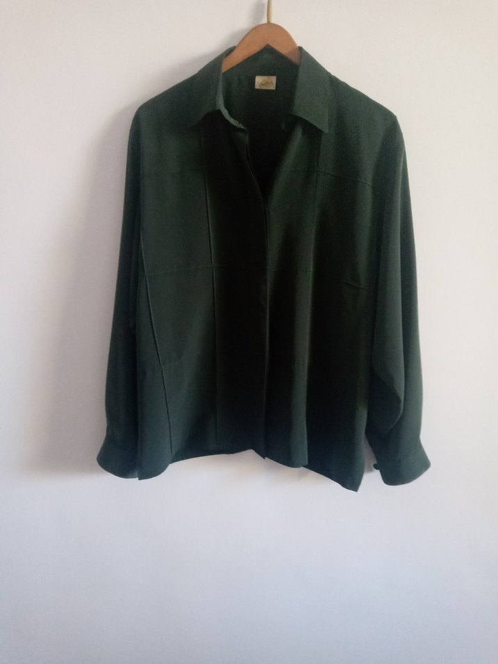 Keten kumaştan, uzun kollu, düğmeli ve yakalı koyu yeşil gömlek. Rahat kesimi ve minimal tasarımı ile ofis için uygun. Butik ürünü. Boy : 68cm En: 116 cm