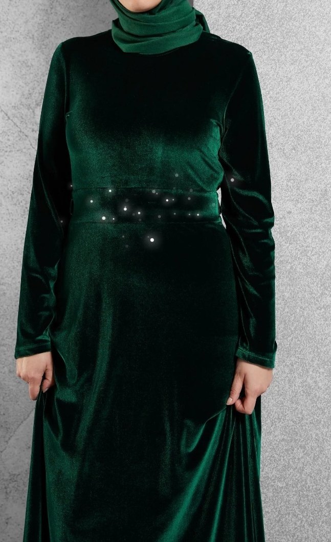 Uzun kollu, yüksek yakalı ve drapeli tasarıma sahip koyu yeşil kadife kumaştan yapılmış, şık ve gösterişli abiye elbise.