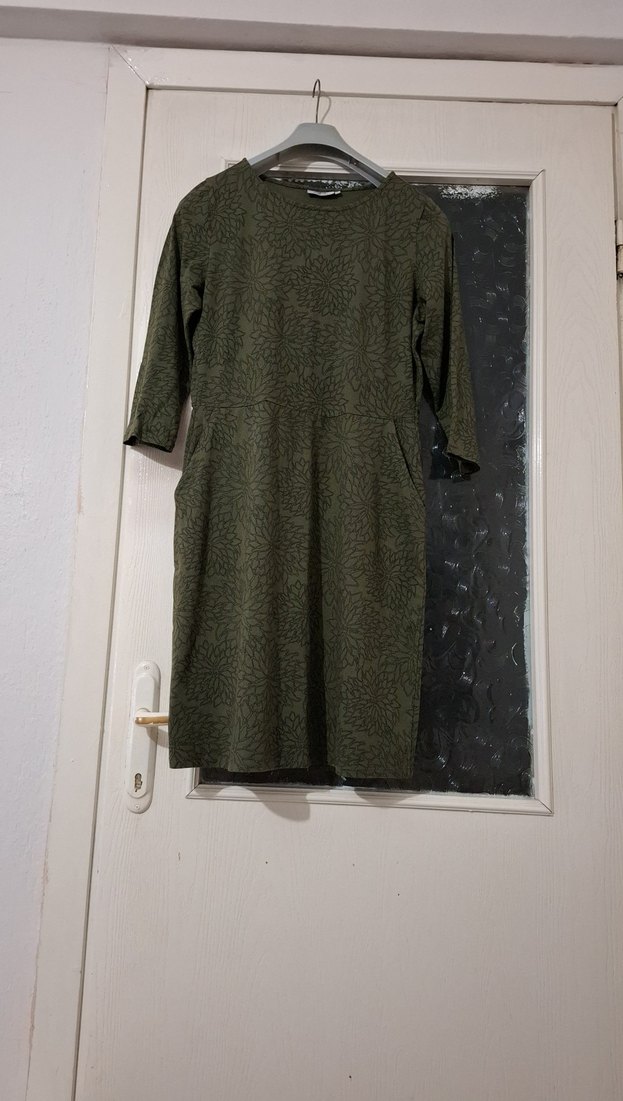 Uzun kollu, koyu yeşil,desenli, cepli, beli lastikli rahat ve güzel bir elbise iki kol arası 55 bel 43 kol boyu 49,5 boy 104 cm,likralı.