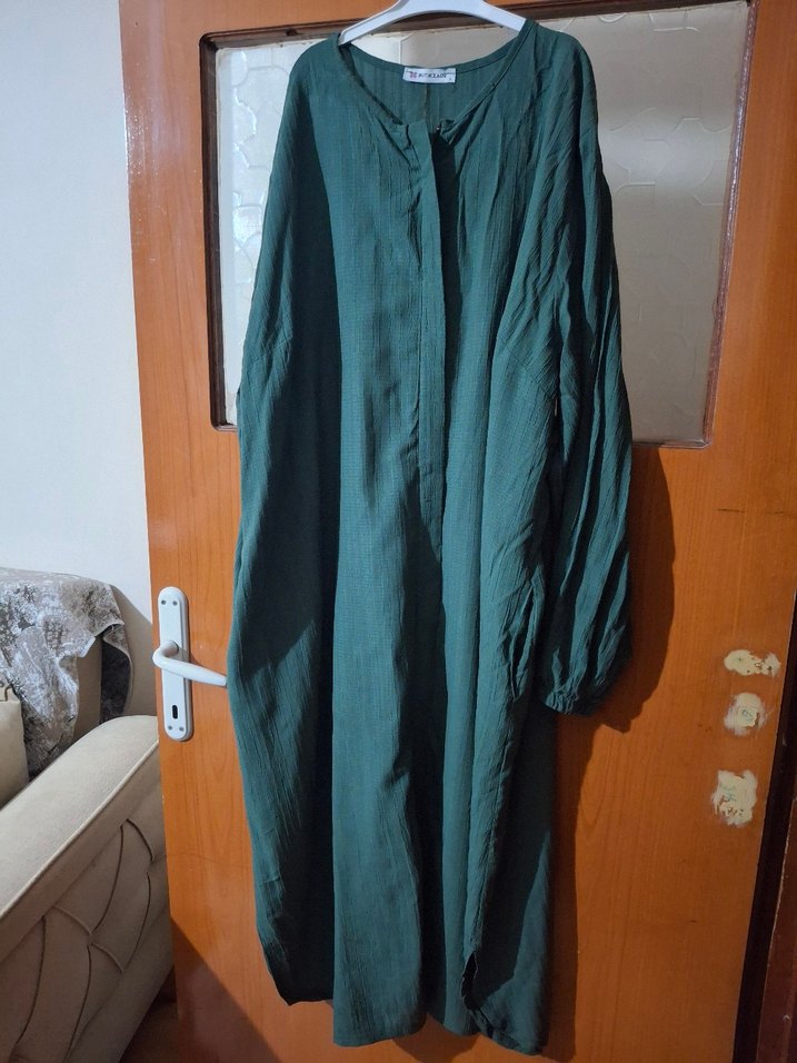 Yumuşak keten kumaştan, bol kesim uzun kollu koyu yeşil takım . Yüksek yakalı, drapeli ve minimalist bohem tarzda, mütevazı kullanıma uygun.