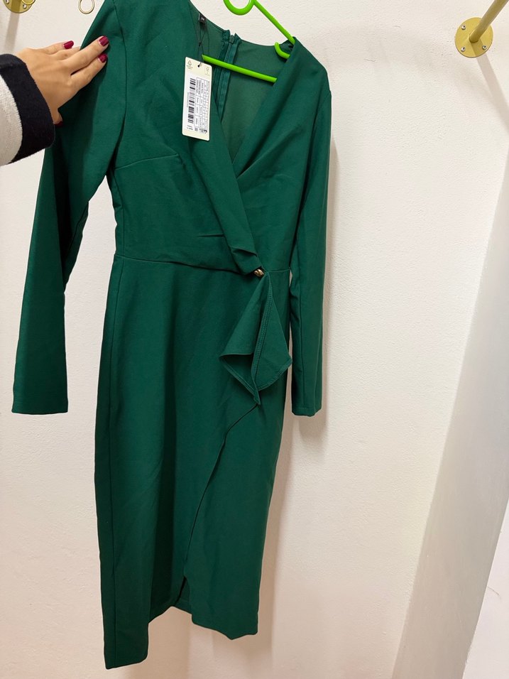 Bu uzun kollu, midi boy, fitted kesim elbise koyu yeşil renkte olup iş ve sokak modasına uygundur. Desensiz ve sarma detaylıdır.