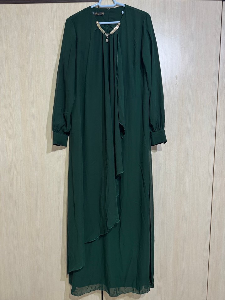 Uzun, bol kesim elbise, uzun kollu ve yüksek yakalıdır. Drapeli detaylı, yumuşak sentetik kumaştan, sade ve modern klasik stil sunar. Koyu yeşil renkte ve desensizdir. Tesettür abiye