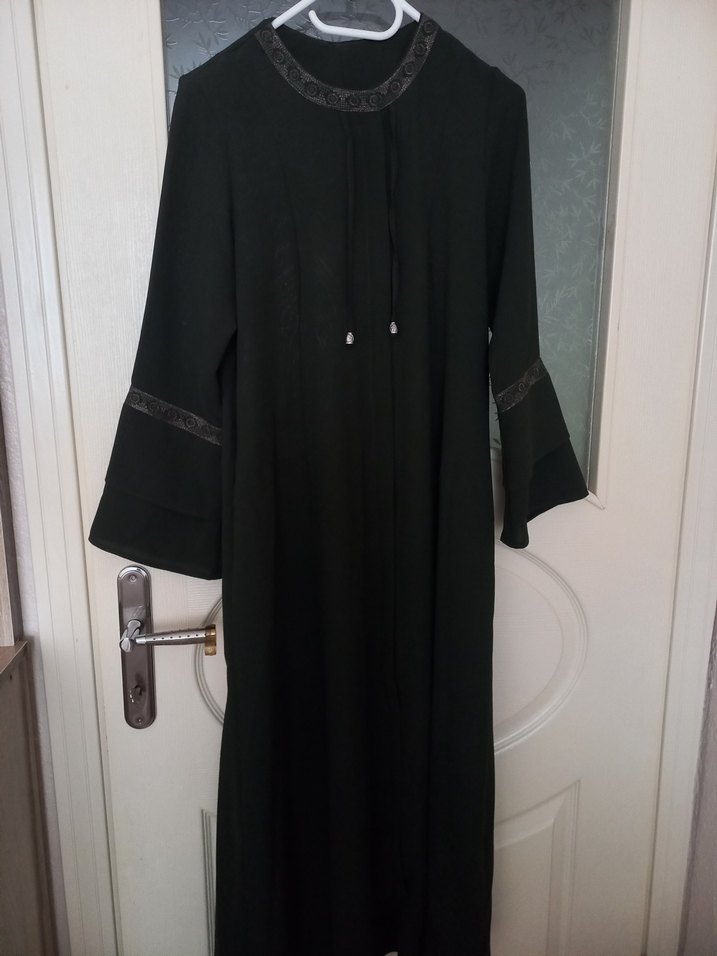 Uzun kollu, yakası işlemeli ve drapeli detaylara sahip yeşik uzun ferace , günlük kullanıma uygun. Boy:130 cm