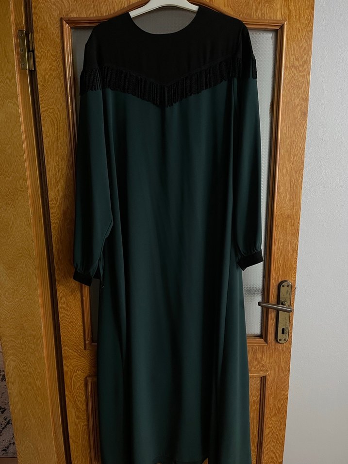 Sentetik kumaştan yapılmış, uzun kollu ve salaş kesimli koyu yeşil uzun elbise.
